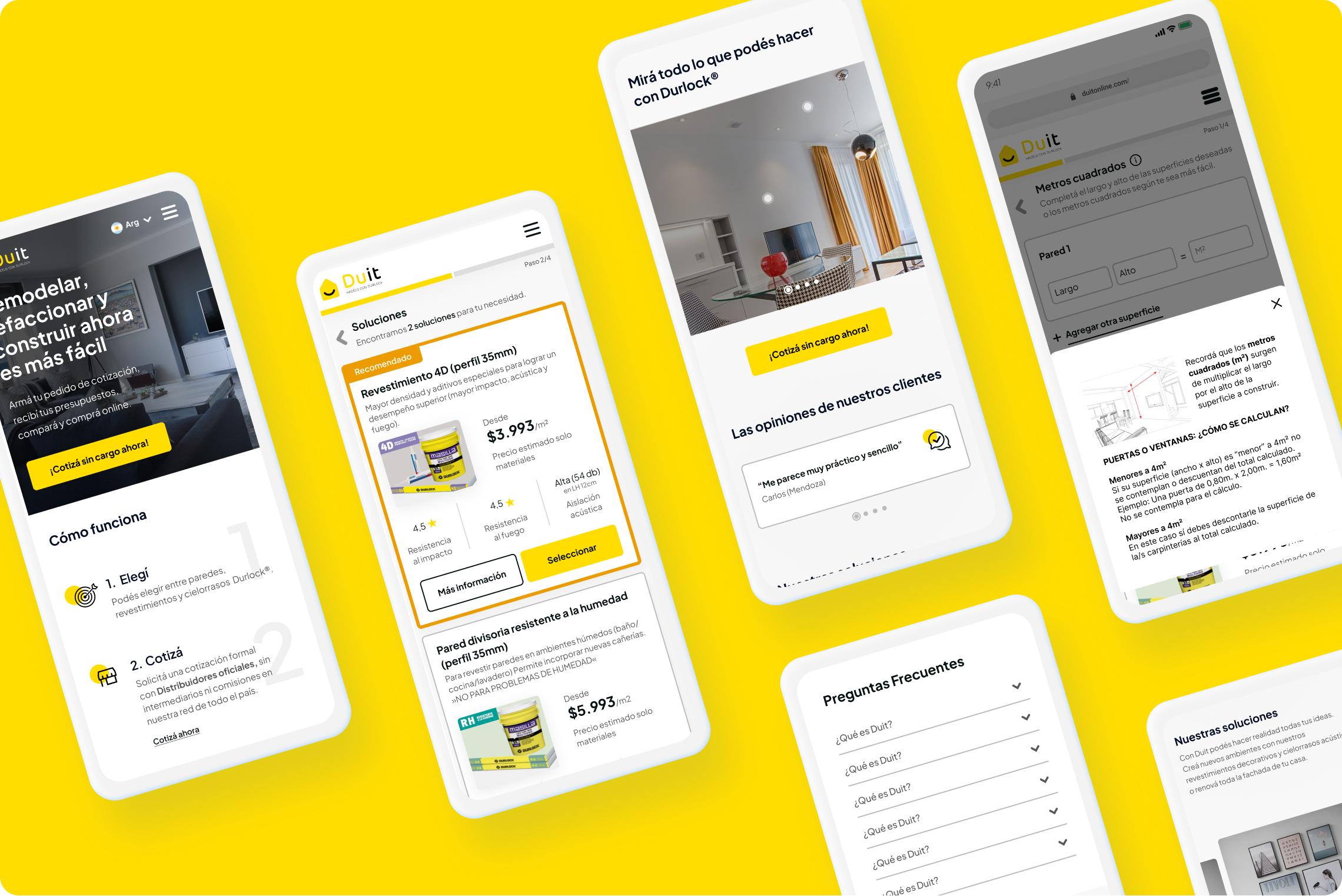 Durlock offers an online quotation tool —Duit— designed to help users select construction solutions based on their specific needs. However, the original experience involved a high level of complexity: multiple construction categories, project segments, environments, technical requirements, and dimensional inputs, all within a single flow.